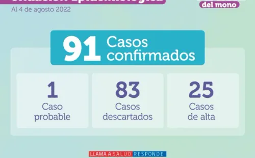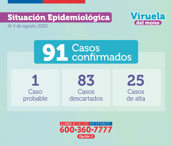 A la fecha, en Chile se han reportado 92 casos de viruela del mono, de los cuales 91 han sido casos confirmados y un caso probable.