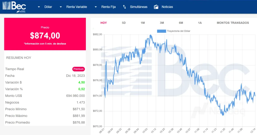 A esta hora de la mañana del lunes 18 de diciembre, un día después del Plebiscito, el dólar está a $874,00. De esta manera, la divisa sigue con la tendencia a la baja y manteniéndose por debajo de la barrera de los 900 pesos.