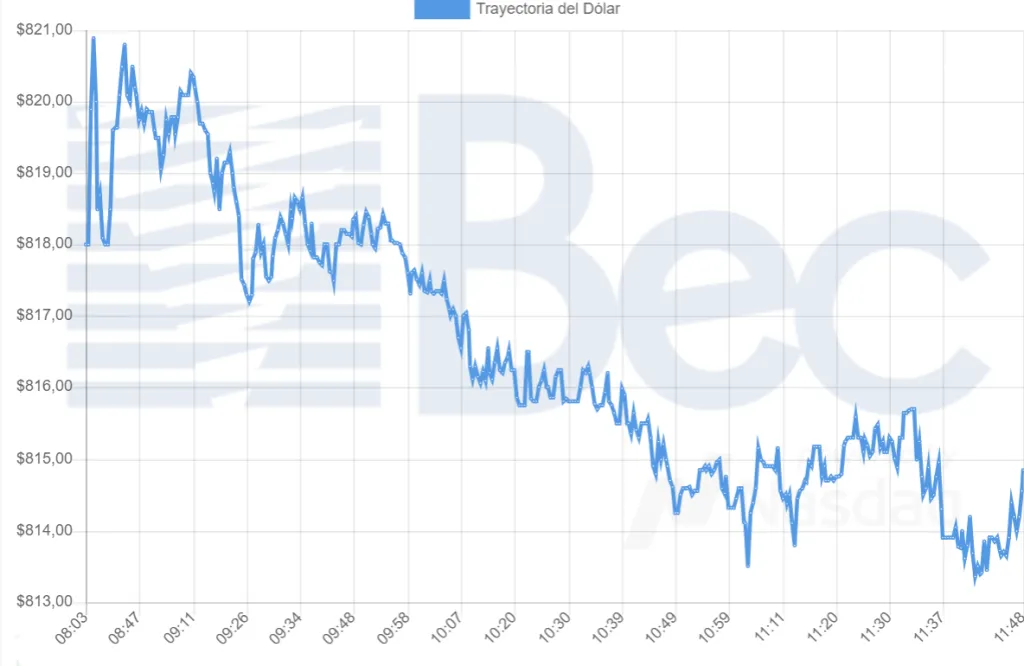 Este martes 18 de julio, el dólar abrió al alza con un valor de $818,00 a las 08:13 horas. Unos pocos minutos después, a las 08:16, llegó a su precio máximo con $820,90 (su valor más alto desde el 21 de marzo, que fue $822,30). Desde allí en adelante, la divisa comenzó a fluctuar de manera descendente hasta llegar a su precio actual.