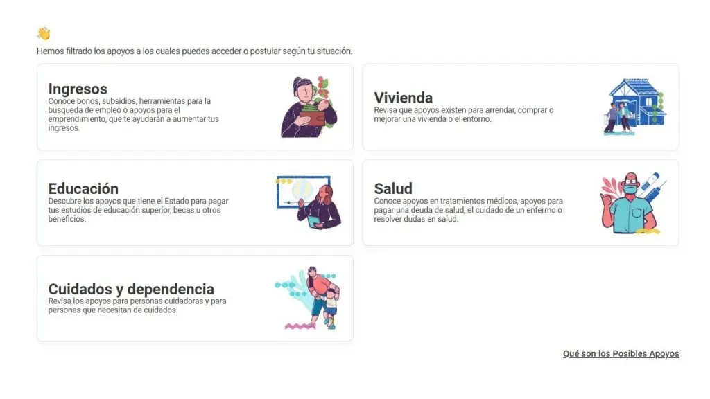 Una vez que hayas hecho ingreso de alguna de estas opciones, podrás conocer diferentes apoyos que puedes recibir en distintas materias; como bonos, subsidios, becas de estudio, subsidios de vivienda como compra o arriendo y apoyos para pagar deudas de salud, entre otras cosas.