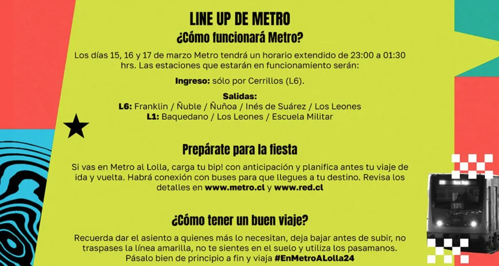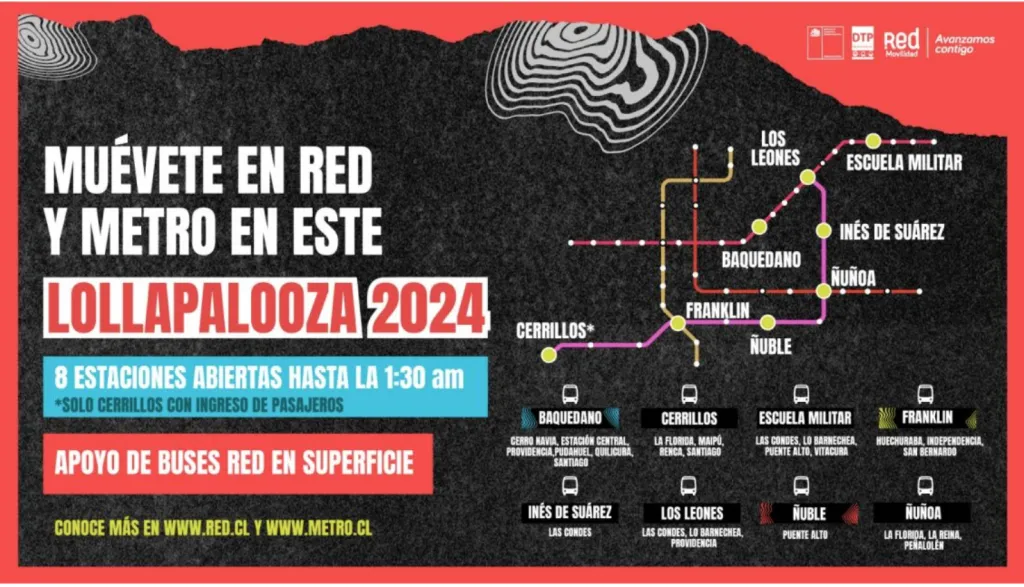 El tren subterráneo confirmó que durante estas fechas habrá apoyo de buses RED para trasladar a todos los asistentes al Lollapalooza 2024 en Chile. Puedes conocer los recorridos a través de www.red.cl.
