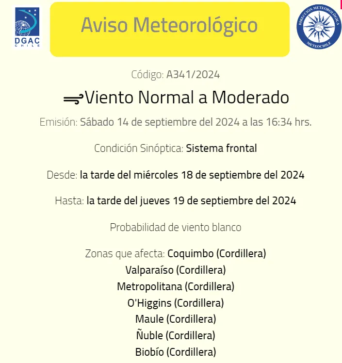 En el sitio meteochile.gob.cl la Dirección Meteorológica de Chile emitió un aviso meteorológico por un sistema frontal de viento blanco entre el miércoles 18 y el jueves 19 de septiembre entre las regiones de Coquimbo al Biobío, incluidas las regiones de Valparaíso, Metropolitana, O’Higgins, Maule y Ñuble, preferentemente en zonas cordilleranas.