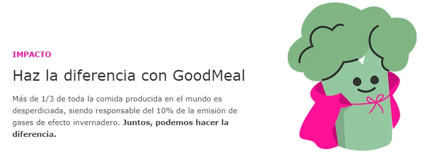 – Reducción del desperdicio de alimentos: Cada producto rescatado a través de GoodMeal genera un impacto positivo e inmediato en el medioambiente. Con cada compra, estás evitando la emisión de 2.5 kilos de CO2, lo que es equivalente a cargar tu teléfono 422 veces.