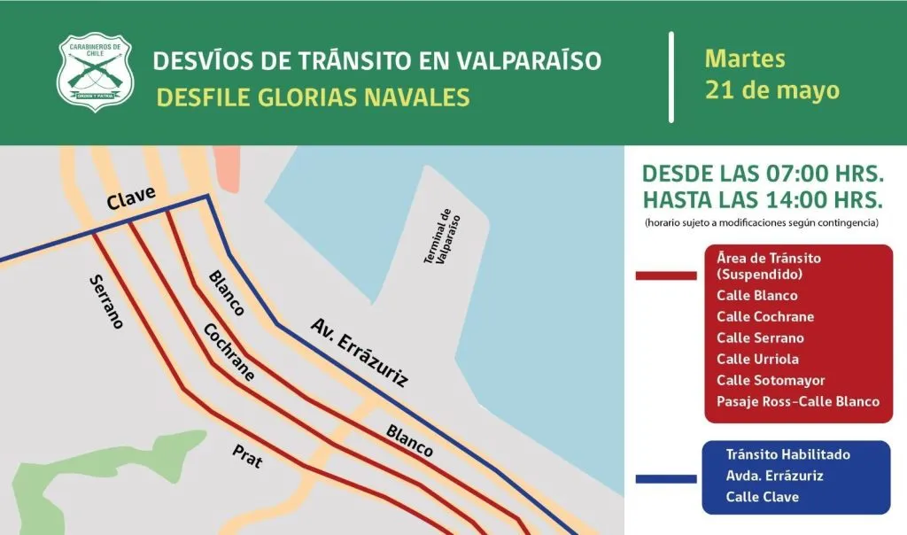 Además, se informa que para los vehículos de emergencia el acceso al sector será por calle Serrano, Sotomayor, Cochrane, Blanco, Urriola y San Martín.