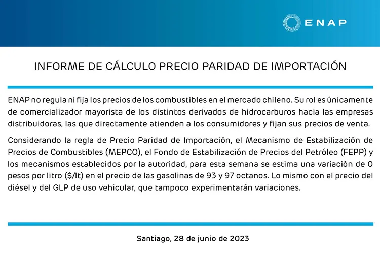 Cabe recordar que ENAP no es la institución que fija los precios de los combustibles en Chile, sino que esto se define a través del Fondo de Estabilización de Precios del Petróleo (FEPP), los mecanismos establecidos por la autoridad y el Mecanismo de Estabilización de los Precios del Combustible (Mepco).