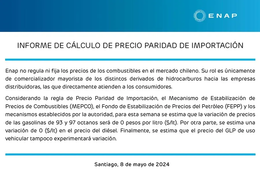 Los informes de ENAP con los respectivos cambios (alzas o bajas) serán publicadas el día miércoles anterior a las fechas mencionadas.
