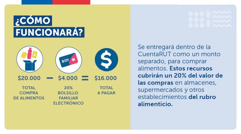 También verás la forma de pago, aunque el Bolsillo Familiar Electrónico solamente funciona mediante depósito bancario como un monto aparte en la Cuenta RUT, el que te sirve para cubrir el 20% de cada compra de alimentos que realices, como en supermercados, minimarkets, carnicerias, ferias, etc.