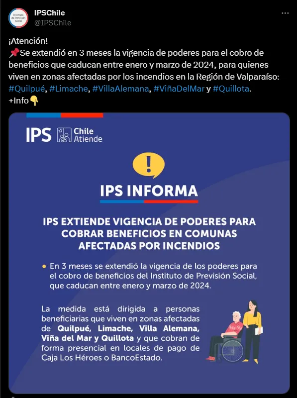 De acuerdo a la información publicada por el IPS en redes sociales, las personas que podrán usar este beneficio son las afectadas de las comunas de Quilpué, Limache, Villa Alemana, Viña del Mar y Quillota y que además cobran de forma presencial en locales de pago de Caja Los Héroes o Banco Estado.