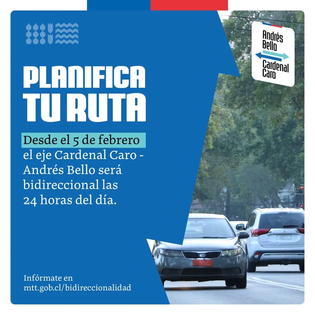 Según confirmó el Gobierno, a partir del lunes 5 de febrero el eje Cardenal Caro – Andrés Bello dejará de ser reversible y pasará a tener bidireccionalidad a cualquier hora. Con ello, si quieres conocer las calles en las que podrás doblar a la derecha e izquierda entra AQUÍ.