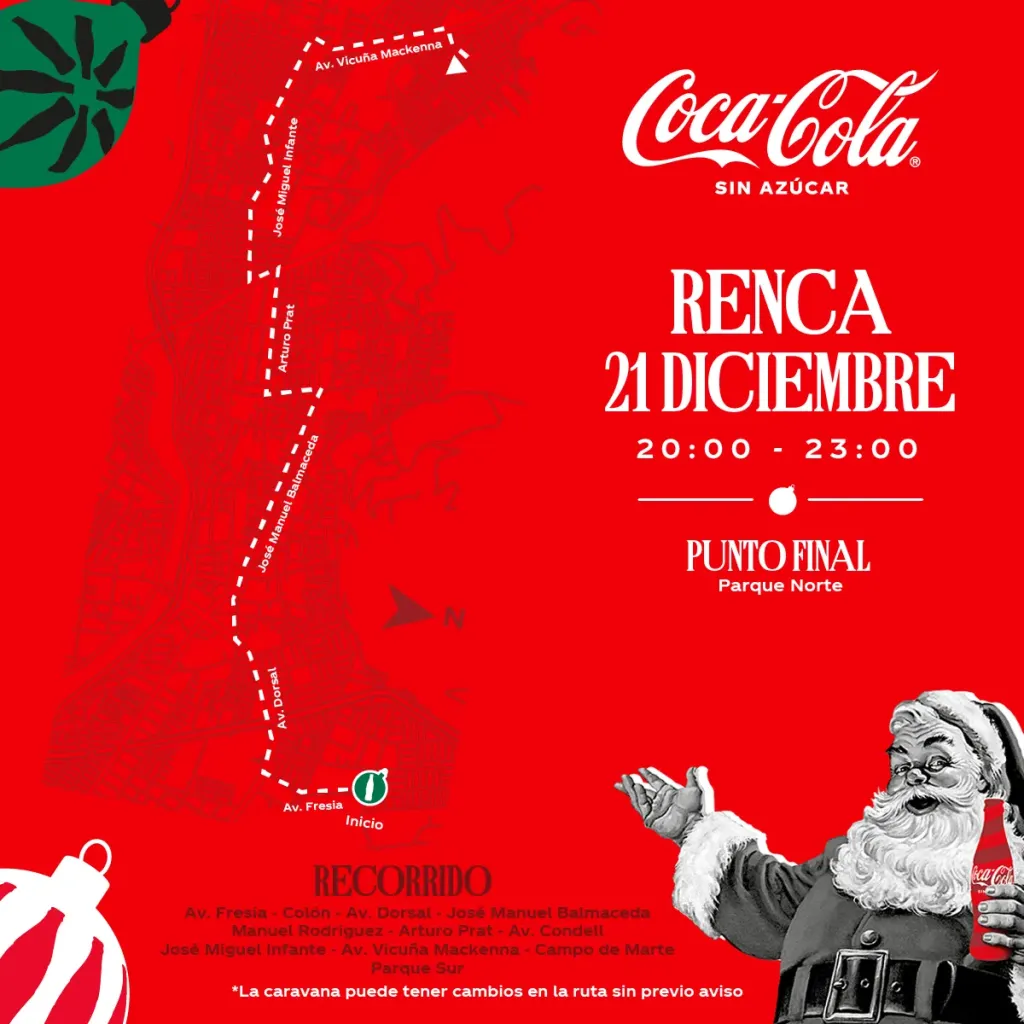 La Caravana Navideña de Coca Cola 2023 en Renca será este jueves 21 de diciembre a las 20:00 horas y tendrá una duración de tres horas hasta las 23:00 horas.