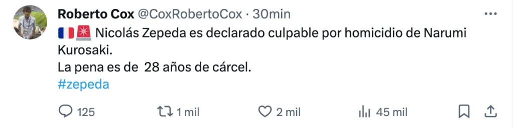 El periodista, a través de su propia cuenta de X, confirmó que “Nicolás Zepeda es declarado culpable por homicidio de Narumi Kurosaki. La pena es de 28 años de cárcel”. Recordemos que la desaparición de Narumi cuenta con una data de 7 años y 16 días, fecha en la que aún no se sabe de su paradero.