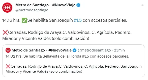 La estaciones Bellavista de la Florida y San Joaquín están habilitadas solo con acceso parciales.