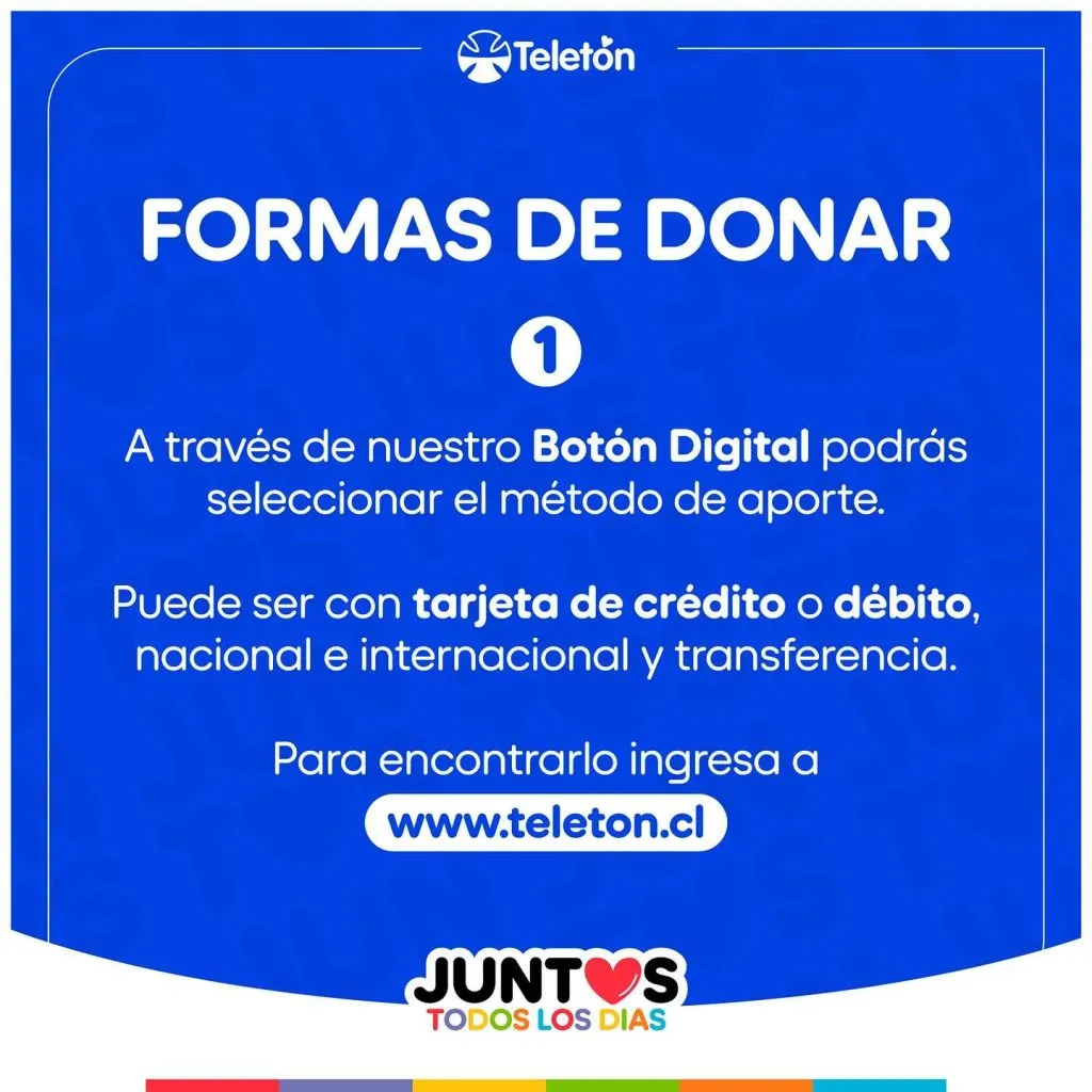 - Igualmente, recuerda que puedes donar dinero a la Teletón de forma presencial, pero en las sucursales del Banco de Chile que están en todo el país que puedes revisar AQUÍ.