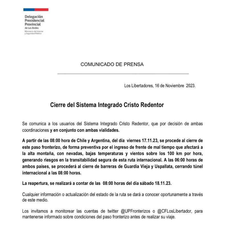 Según informó la Delegación Provincial, el Paso Los Libertadores estará cerrado hasta las 08:00 horas del sábado 18 de noviembre.