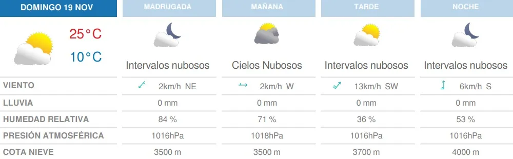 Por último, el domingo subirán las temperaturas y llegarán a una máxima de 25°C y una mínima de 10°C. Ese día no lloverá y los cuilos volverán a estar despejados.