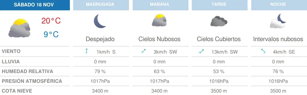 El sábado la máxima llegará a los 20°C y la mínima será de 9°C. No se esperan lluvias, pero los cielos continuarán nubosos.
