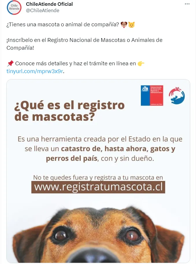 El Registro Nacional de Mascotas es un programa, impulsado por la Subsecretaría de Desarrollo Regional y Administrativo, que tiene como objetivo promover la tenencia responsable mediante la implementación de servicios veterinarios, educación y sistemas de registro, ejecutados a través de las municipalidades.