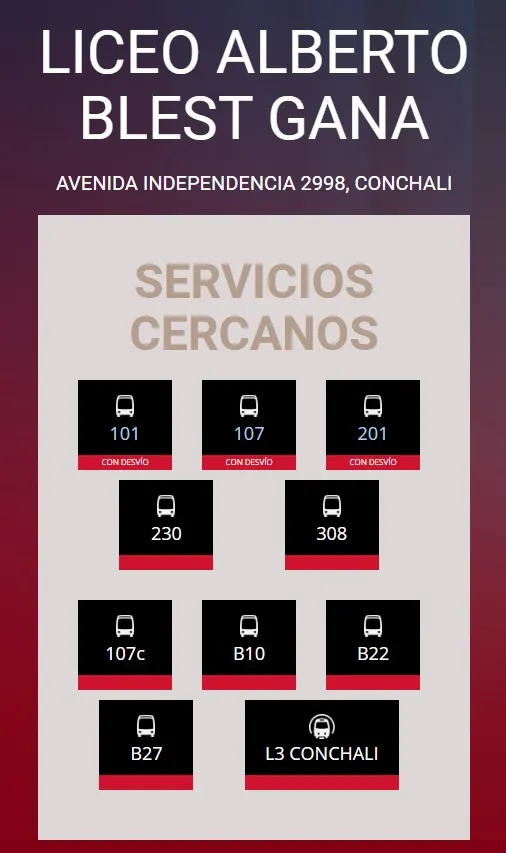 Por ejemplo, si realizamos una búsqueda para el Liceo Alberto Blest Gana, ubicado en Independencia, arroja que los siguientes servicios pasan cerca: 101, 107, 201, 230, 308, 107c, B10, B22, B27, L3 Conchalí.