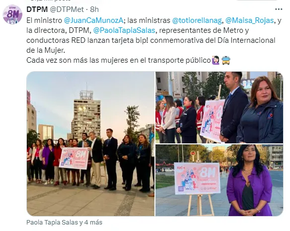Ante esto, distintas autoridades de Gobierno entre las que se encontraban el ministro del Transporte, Juan Carlos Muñoz, la ministra de la Mujer, Antonia Orellana, la directora de DTPM, Paola Tapia y representantes de Metro y Red lanzaron una edición conmemorativa de la tarjeta Bip! del 8M.