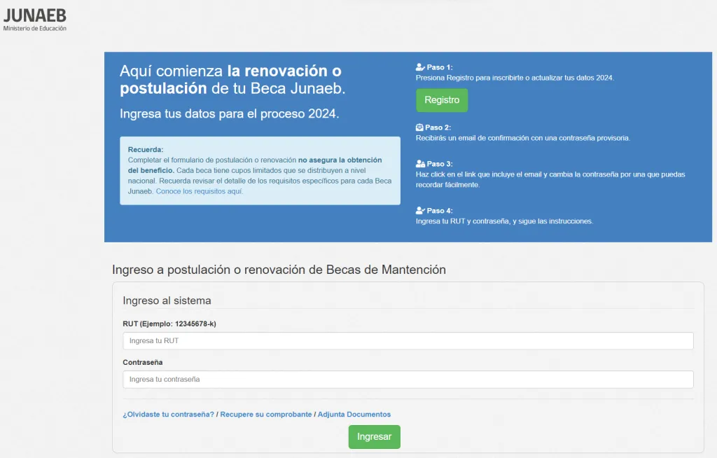 Para postular a la Beca Indígena debes ingresar a www.portalbecas.junaeb.cl/. Una vez dentro, haz clic en Postula o Renueva Becas Junaeb y luego ingresa al sistema con tu RUT y contraseña. Si no tienes, puedes registrarte o actualizar tus datos haciendo clic en Registro.