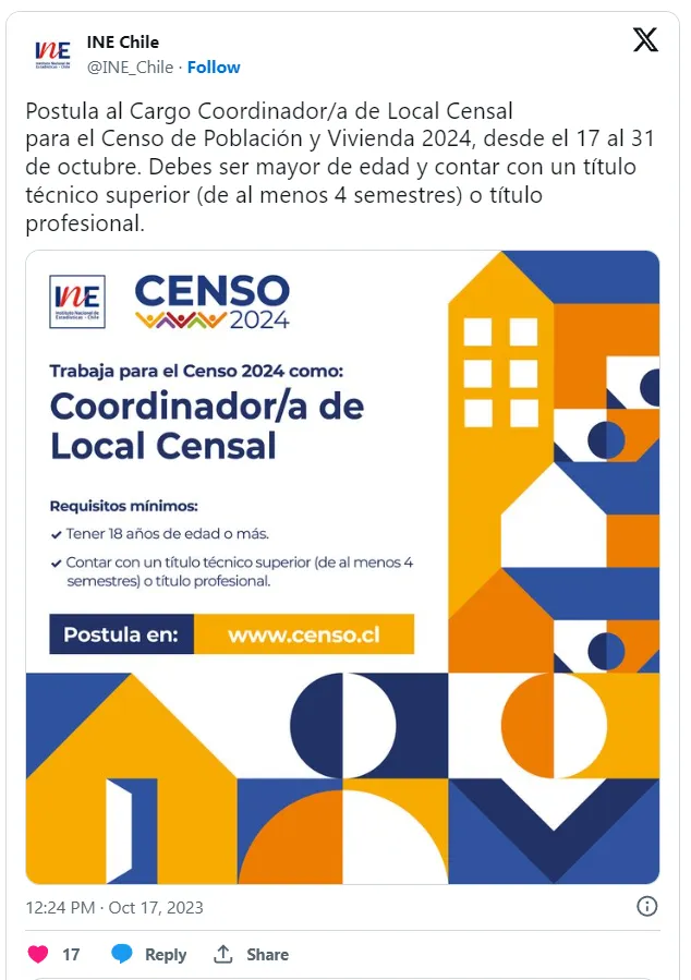 El próximo año se llevará a cabo el Censo 2024, encuesta que no se realizaba en Chile desde el año 2017. En este contexto, el Instituto Nacional de Estadísticas (INE) hizo un llamado a las personas para que postulen al cargo de Coordinador de Local de Censo, el cual consta de 586 cupos en total, distribuidos en las 16 regiones del país.