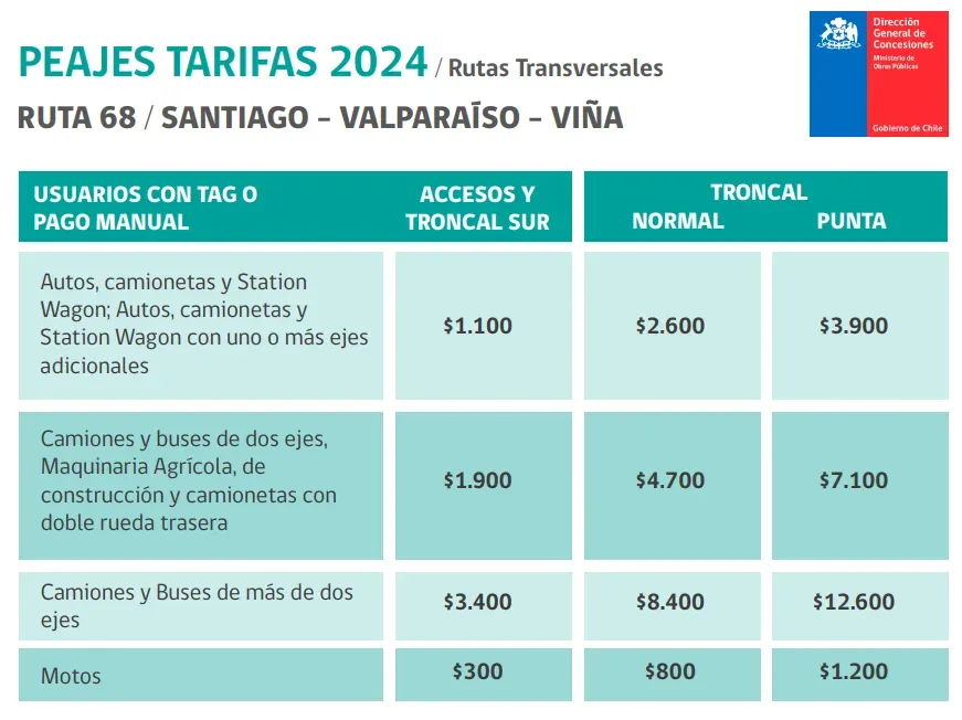 El MOP informa los siguientes valores para la Ruta 68 / SANTIAGO – VALPARAÍSO – VIÑA: