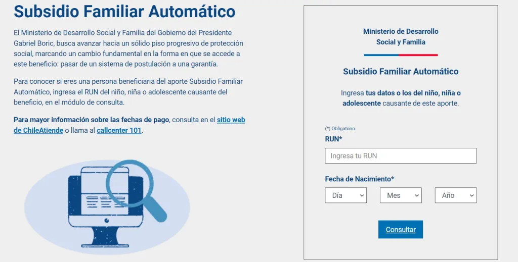 Para saber si eres beneficiario, tu monto y fecha de pago del Subsidio Familiar Automático, debes ingresar a la pagina web www.sufautomatico.gob.cl y digitar tu RUT y fecha de nacimiento.