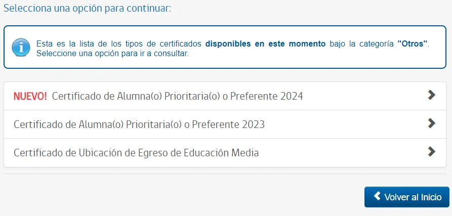 - Selecciona “Certificado de alumna (o) Prioritaria (o) o Preferente 2024”.