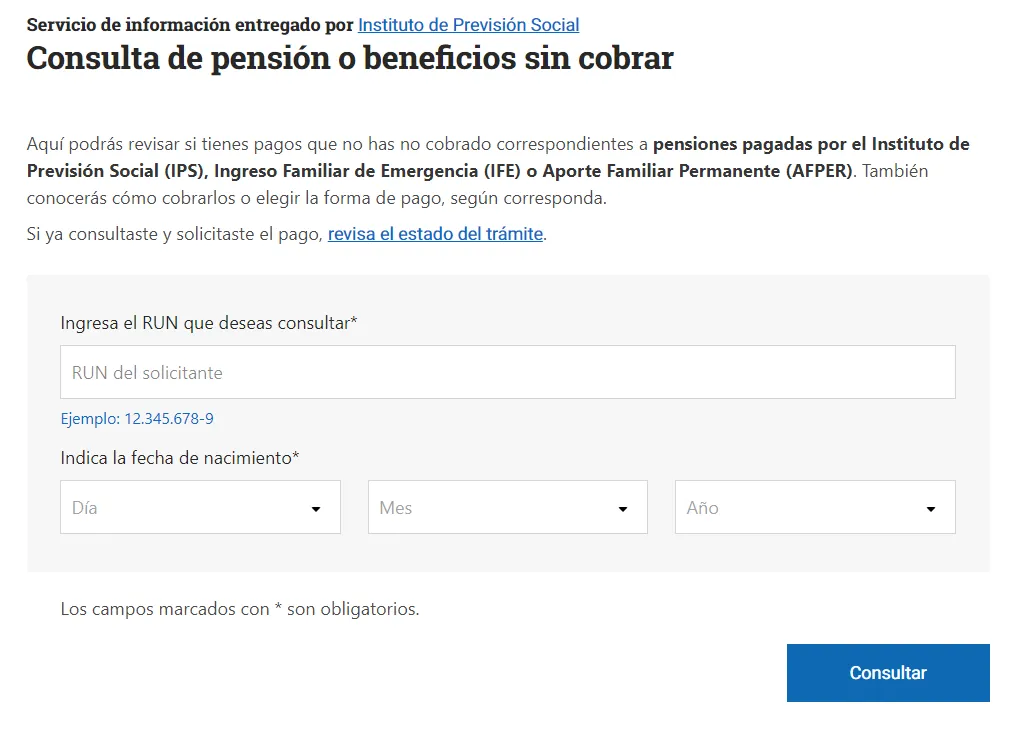 El Instituto de Previsión Social (IPS) posee una plataforma web de consulta que permite revisar si una persona no ha cobrado alguno de los siguientes diversos bonos y beneficios como, por ejemplo, la Pensión Garantizada Universal (PGU); pensiones previsionales y por leyes especiales del IPS; Aporte Familiar Permanente (ex Bono Marzo) y el Ingreso Familiar de Emergencia (IFE).