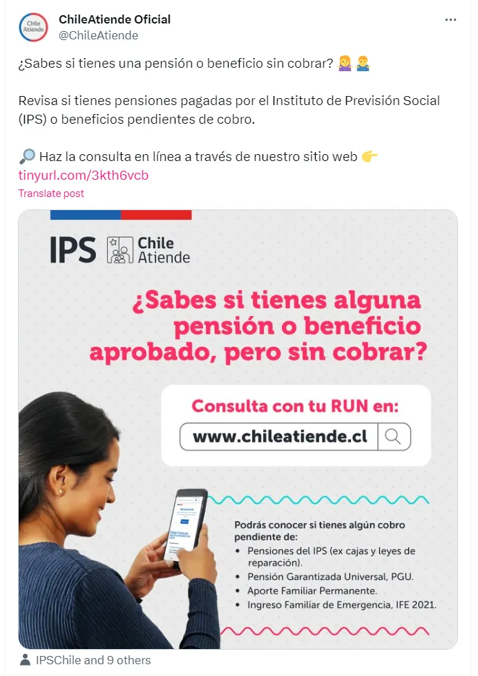 Si no sabes si eres beneficiario de algún bono y todavía no lo cobras, puedes ingresar a la plataforma web de consulta del Instituto de Previsión Social (IPS), el cual permite revisar si una persona no ha cobrado alguno de los siguientes diversos beneficios como, por ejemplo, la Pensión Garantizada Universal (PGU); pensiones previsionales y por leyes especiales del IPS; Aporte Familiar Permanente (ex Bono Marzo) y el Ingreso Familiar de Emergencia (IFE).
