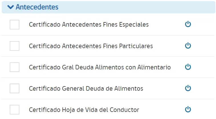 - Una vez dentro del sitio web del Registro Civil pulsa en “Antecedentes” y selecciona el certificado que necesites:
