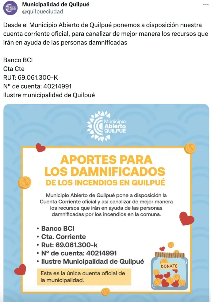 Desde la municipalidad de Quilpué habilitaron de igual forma una cuenta corriente oficial que busca canalizar de mejor manera los recursos que lleguen y en directa ayuda a las personas damnificadas por los incendios: