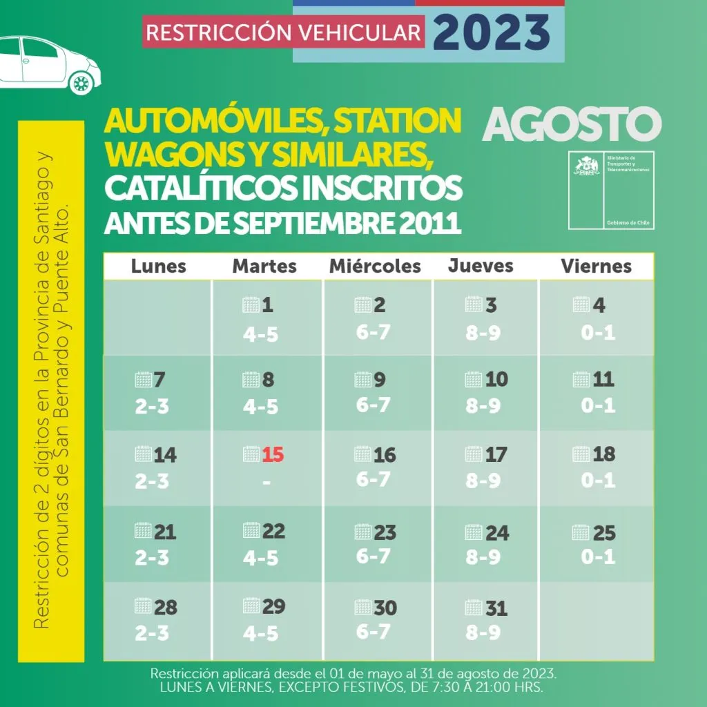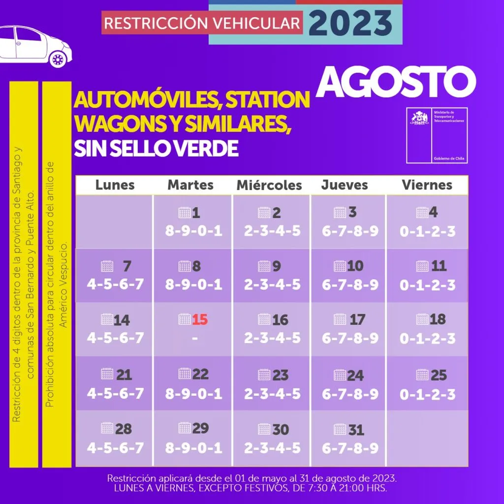 De acuerdo al calendario del la restricción vehicular del Ministerio de Transportes y Telecomunicaciones, está contemplado que finalice el 31 de agosto de 2023.