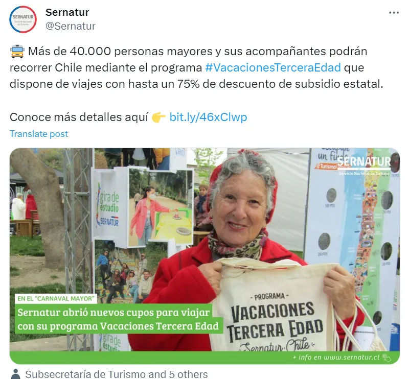 El Servicio Nacional de Turismo (Sernatur) anunció la apertura de 3.500 nuevos cupos para recorrer Chile con el programa “Vacaciones Tercera Edad”, el cual espera beneficiar a más de 40.000 personas mayores y sus acompañantes con viajes con hasta un 75% de descuento de subsidio estatal.
