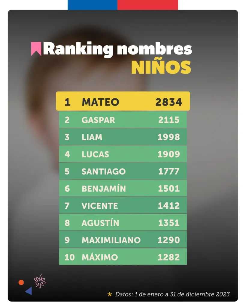 Con ello, se repite la tendencia de Mateo como el nombre más común en Chile, lo que ya ha sucedido en 2021 y 2022, de hecho, ese último año la cifra llegó a 3.273 inscritos.