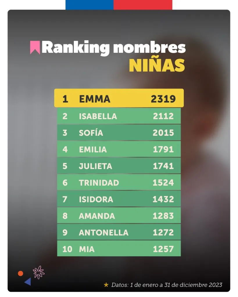 Según el Registro Civil, entre el 1 de enero de y el 31 de diciembre de 2023, los nombres de mujeres que más se inscribieron en Chile fueron: