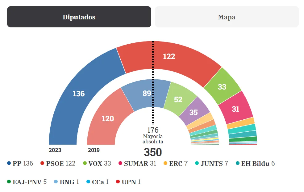 Las votaciones en España no otorgaron a ningún partido el apoyo suficiente para formar un gobierno. Esto es así, ya que el Congreso de los Diputados tiene 350 escaños, por lo que se necesitan 176 para tener mayoría absoluta, la cual ningún partido obtuvo.