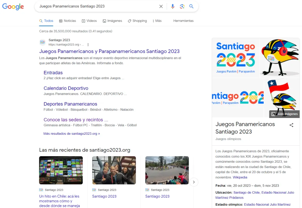Al escribir términos como “Juegos Panamericanos Santiago 2023” o “Juegos Panamericanos 2023” el buscador de Google entrega toda la información resumida, como las fechas clave, calendario, así como las noticias destacadas del evento.