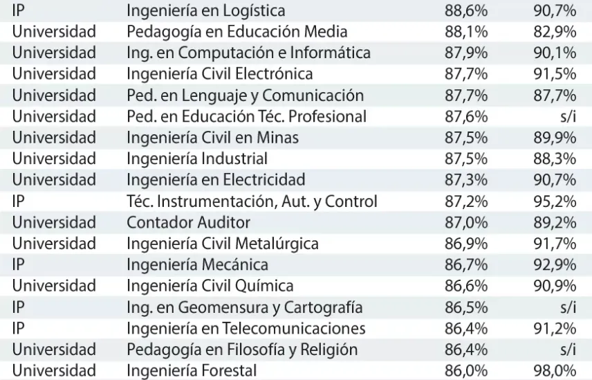 En cuarto lugar está Técnico en Administración Pública o Municipal con una empleabilidad en segundo año de 96,5%, en quinto lugar se encuentra Enfermería con 96,4% (porcentaje mayor que el año pasado), en sexto lugar está Ingeniería en Gestión Pública impartida en universidad con un 96,4%, en séptimo lugar está Obstetricia y Puericultura con un 95,8%, en octavo lugar se encuentra Ingeniería en Logística con 94,7%, en noveno está Ing. Civil en Computación e Informática con 93,9% y en décimo lugar está Ing. Civil Ambiental con un 93,3%.