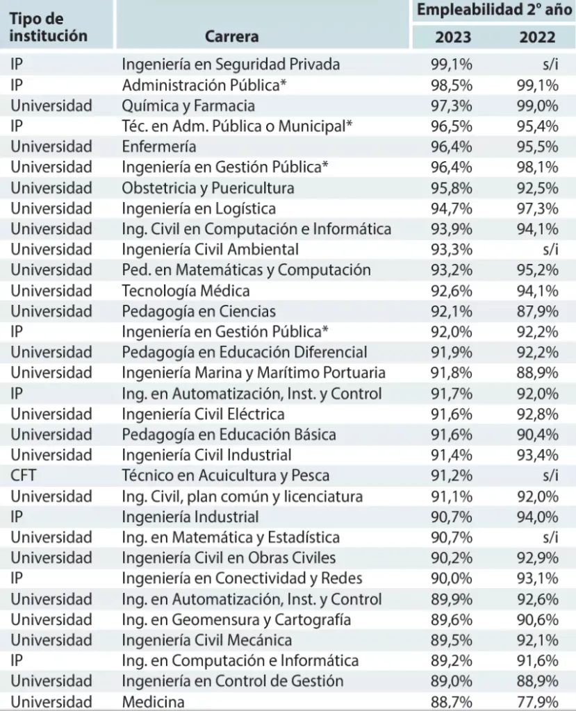 Como se puede observar, las estadísticas oficiales de 2023 demuestran que hay una disminución generalizada en la empleabilidad en comparación con el año pasado, sin embargo, 26 carreras de universidades, IP y CFT tienen a más del 90% de los egresados trabajando al segundo año. Además, en el top 50 ninguna carrera baja del 86%.