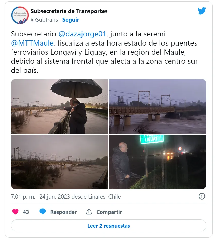 El ministro de transportes informó que “lo que pasa desde Rancagua hacia el sur es que tenemos al menos dos puentes que están muy complicados, que son el puente de Lircay y el Longaví, pero tenemos otros que están en evaluación, algo que vamos a poder ir sabiendo durante la semana, cuando la situación del caudal de los ríos empiece a amainar”.