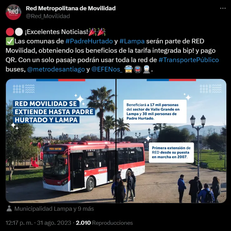 Con esta ampliación en los servicios de la Red Movilidad, la cobertura de transporte ahora será de 36 comunas. Las originales 32 del “Gran Santiago”, además de San Bernardo, Puente Alto y las dos nuevas comunas ubicadas fuera del radio urbano de Padre Hurtado y Lampa.