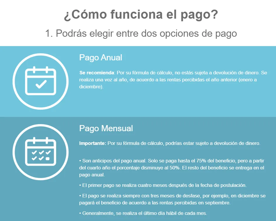 Al postular, la trabajadora puede elegir la forma de pago que más le acomode. El pago anual es el más recomendable, ya que no está sujeto a devoluciones. Mientras que el pago mensual, por su fórmula de cálculo, puede estar sujeto a devolución de dinero.