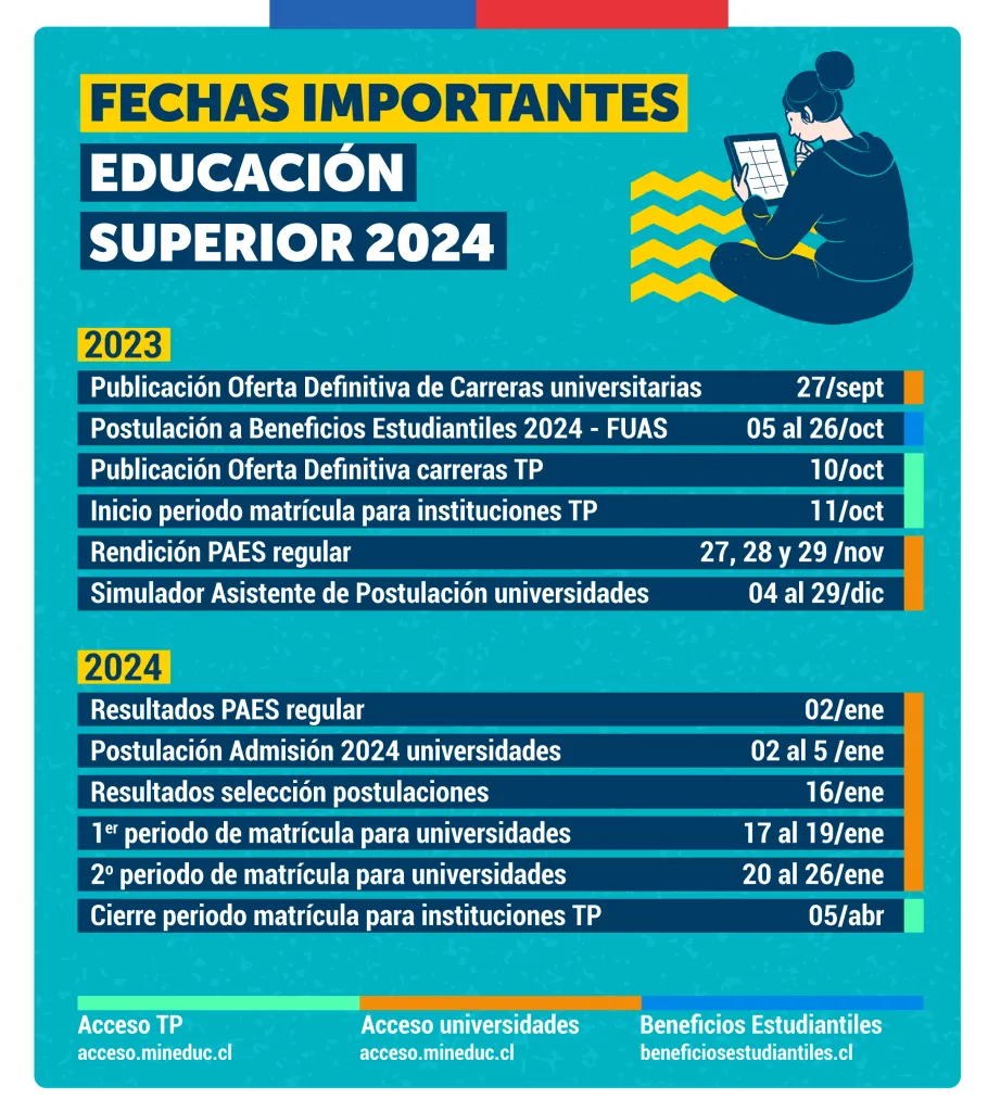 De acuerdo a información del Mineduc, las postulaciones a las universidades se realizarán entre el 2 al 5 de enero de 2024, y los resultados de la selección se publicarán el 16 de enero.