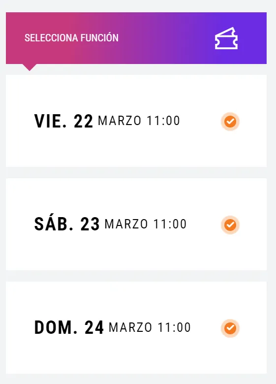 Para comprar tus entradas debes ingresar a Punto Ticket (AQUÍ) y hacer clic en la función que quieras (viernes, sábado o domingo). Luego selecciona “Categoría” y pincha en “Comprar tu entrada”. Posteriormente inicia sesión con tu RUT y contraseña, y presiona en “Ingresar”. Finalmente realiza el pago.