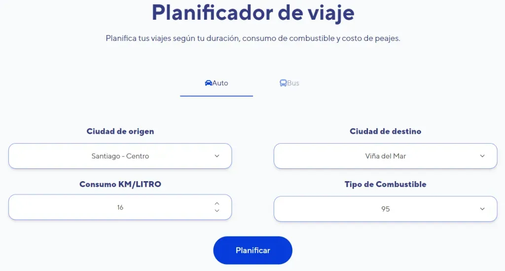 Una vez adentro de este planificador debes seleccionar tu ciudad de origen y ciudad de destino. También el consumo de kilómetros por litro de tu auto (que puedes saber AQUÍ según tu modelo) y el tipo de combustible que usas. Finalmente pulsa en “Planificar”.
