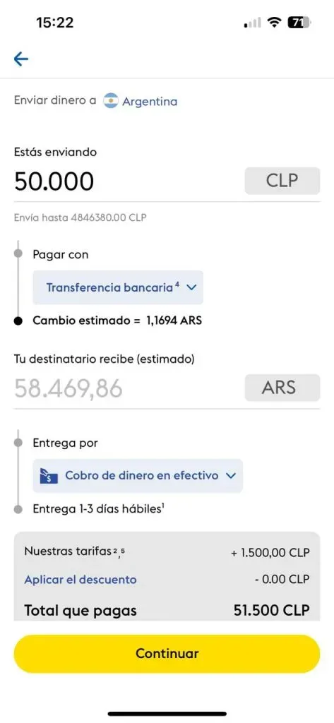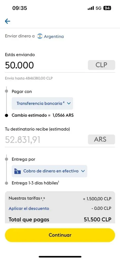 - Si envío de Chile a Argentina $50.000: obtendrás 58.470 pesos argentinos.