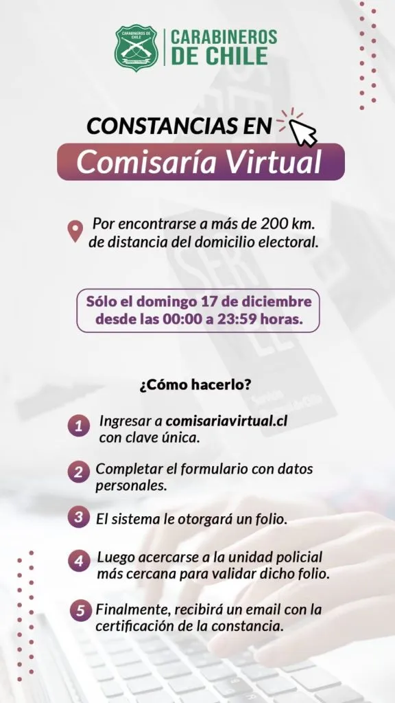 - Encontrarse el día de las elecciones en un lugar situado a más de 200 kilómetros de aquel en el que se encuentra su domicilio electoral. Esto debes acreditarlo el mismo día de las elecciones en una comisaría o retén de Carabineros.