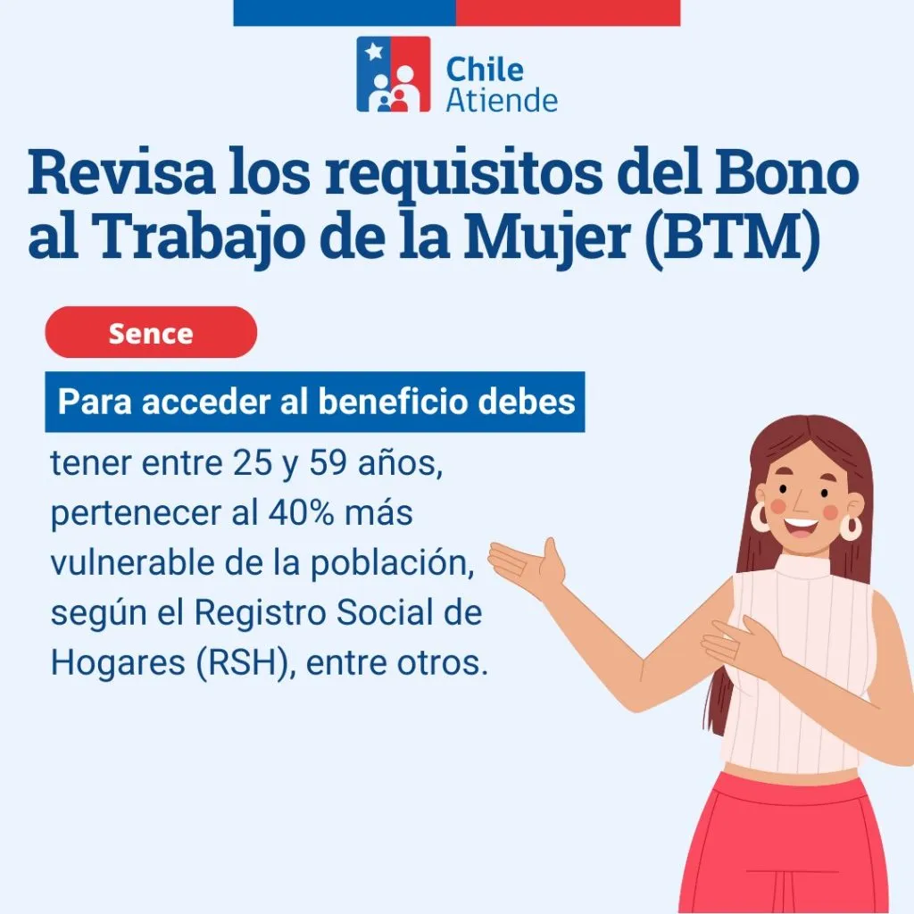 El Bono al Trabajo de la Mujer es entregado por el Sence y consta de un beneficio económico a mujeres que tengan entre 25 y 59 años de edad, estén en el 40% del Registro Social de Hogares y cumplan con el resto de los requisitos.