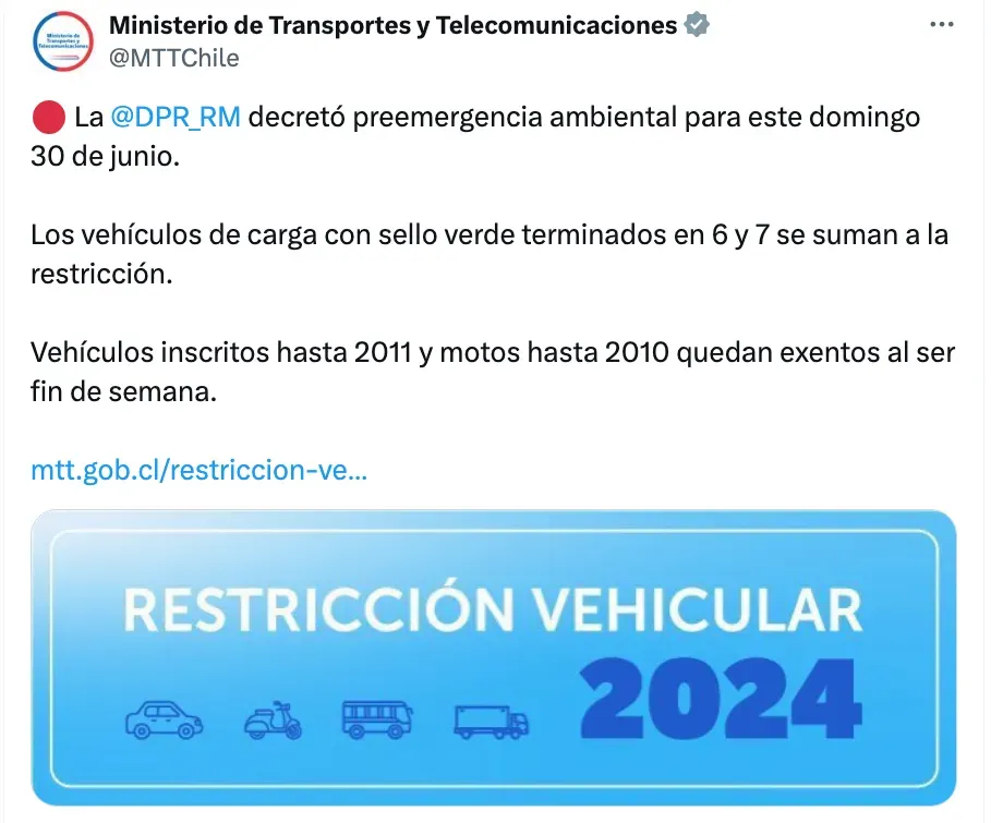 La Delegación Presidencial de la Región Metropolitana decretó este domingo 30 de junio una Preemergencia ambiental en la región, lo que implica la aplicación de ciertas medidas que buscan disminuir la contaminación ambiental que afecta a la RM.
